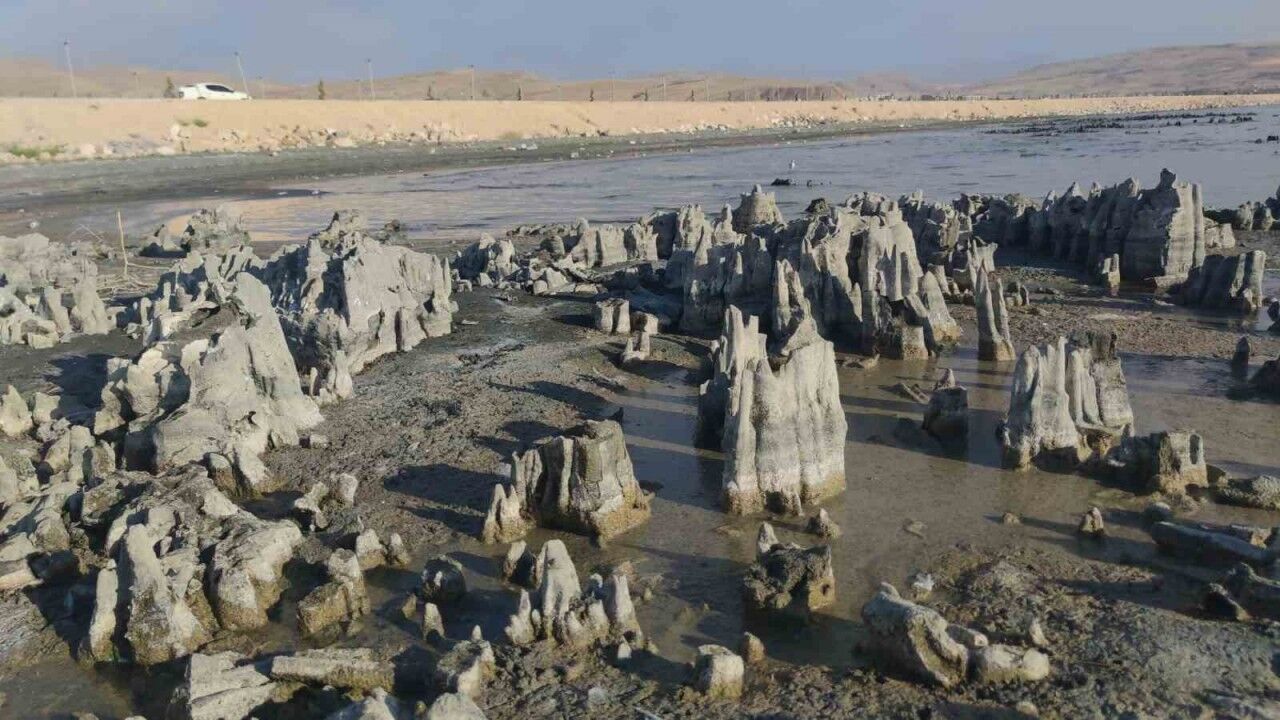 Türkiye’nin en büyük gölü ve dünyanın en geniş sodalı gölü olan Van Gölü, iklim değişikliğinin yol açtığı kuraklık nedeniyle her geçen gün küçülüyor. 3 bin 712 kilometrekarelik alana sahip göldeki çekilme, belirgin şekilde gözlemleniyor. Yağışların azalması ve aşırı buharlaşma dolayısıyla önemli miktarda su kaybının yaşandığı gölün sığ noktalarındaki çekilme yüzlerce metreyi buluyor. Oluşumu asırlar süren mikrobiyalitler, geçmiş dönemlerde seviyenin yükselmesiyle su altında kalan tarihi yapılar ve yerleşim alanlarının, kuraklığın etkisiyle ortaya çıktığı gölün kıyılarındaki değişim uydu görüntülerine de yansıyor.
