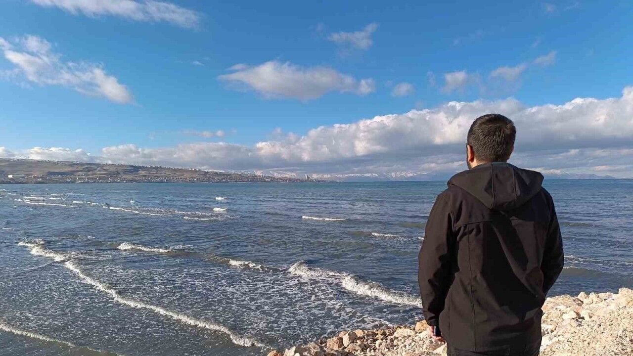 Van’da etkili olan kuvvetli rüzgar nedeniyle Van Gölü’nde oluşan dalgalar, kartpostallık görüntüler oluşturdu.