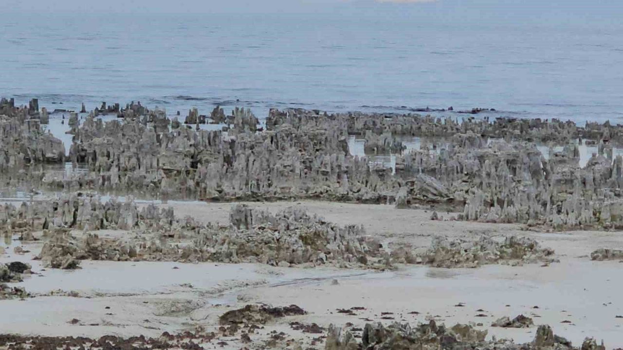 Türkiye'nin en büyük gölü olan Van Gölü'nün Adilcevaz sahilinde yaşanan yağışlara rağmen su seviyesinin düşmesiyle birlikte ortaya çıkan mikrobiyalitler dikkat çekiyor.