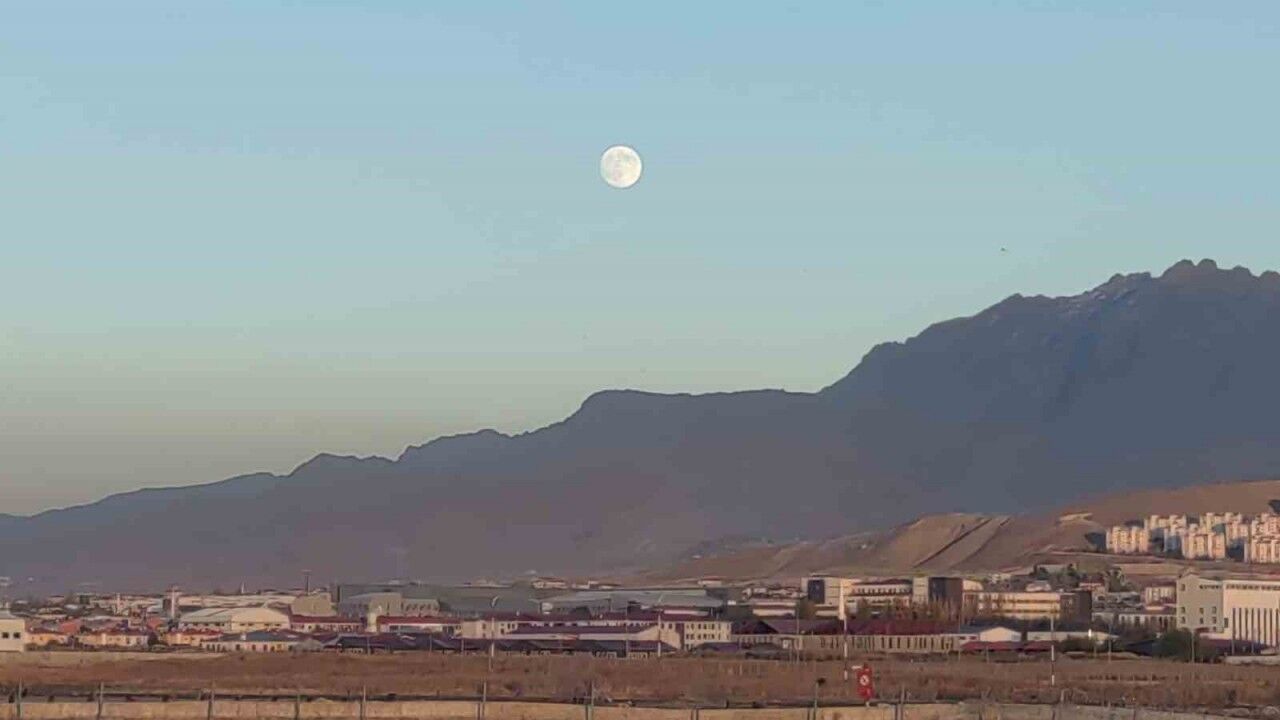 Van’da akşam saatlerinde güneş batarken, doğu ufkunda ayın yükselmesi gökyüzünde etkileyici bir manzara oluşturdu. Gün batımıyla birlikte ayın parlak yüzü aynı anda gökyüzünü süsledi.