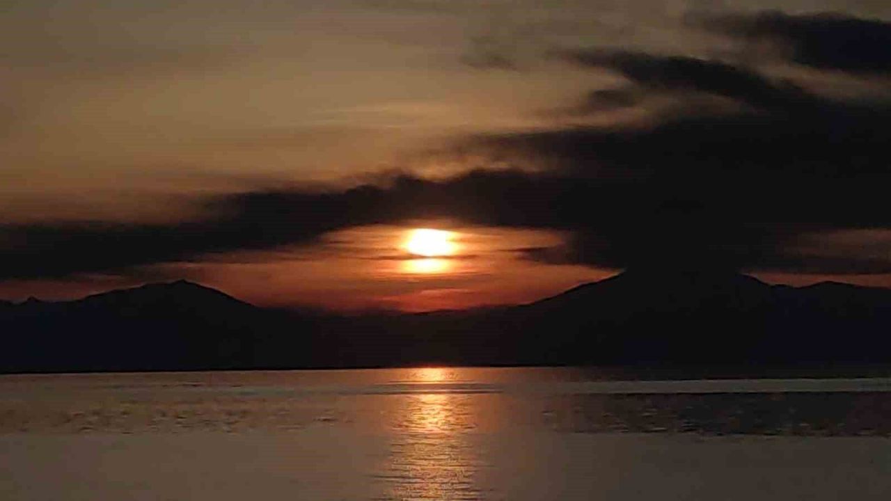 Doğu'nun incisi Van'da bugün, güneşin batışıyla birlikte gökyüzünde adeta bir renk cümbüşü yaşandı. Van Gölü üzerinden süzülerek batan güneş, yerini gümüş bir tepsi gibi doğan aya bıraktı. Akşam saatlerinde Van Kalesi ve Edremit sahil şeridinde bir araya gelen vatandaşlar, gün batımının eşsiz kızıllığına tanıklık etti. Güneşin Van Gölü'nün sodalı sularına vuran son ışıkları, ufuk çizgisini ateş kırmızısına boyadı. Güneşin kaybolmasıyla birlikte Erek Dağı'nın kuzeyin yükselen dolunay, kentin üzerine bir ışık huzmesi yaydı.