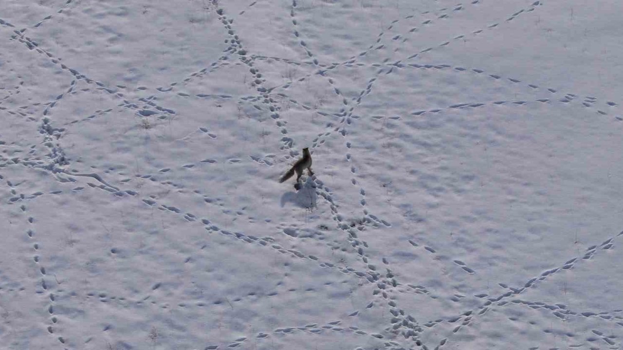 Van'ın karla kaplı yüksek kesimlerinde aç kalan bir tilkinin, avını yakalamak için sergilediği ustalık ve kararlılık dron kamerasına yansıdı.