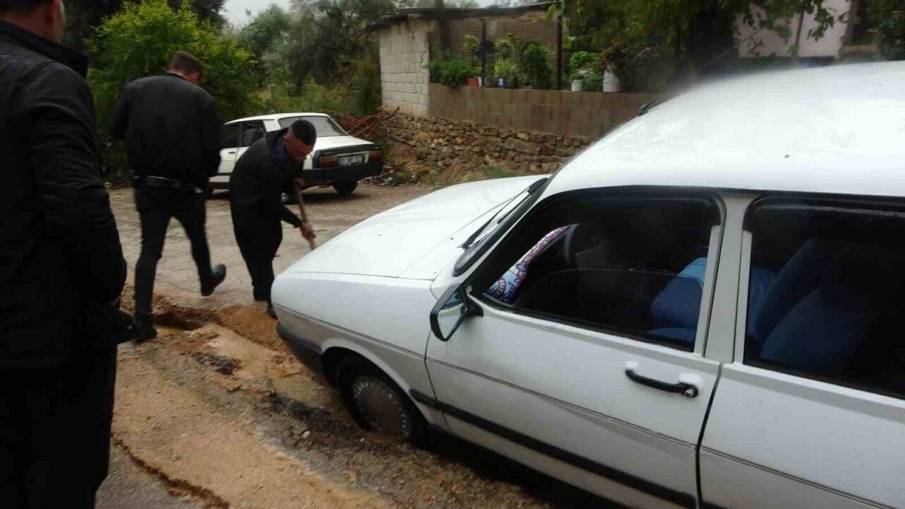 Yolda oluşan çukura bir araç daha düşerken, vatandaşlar tarafından düştüğü yerden çıkartıldı.