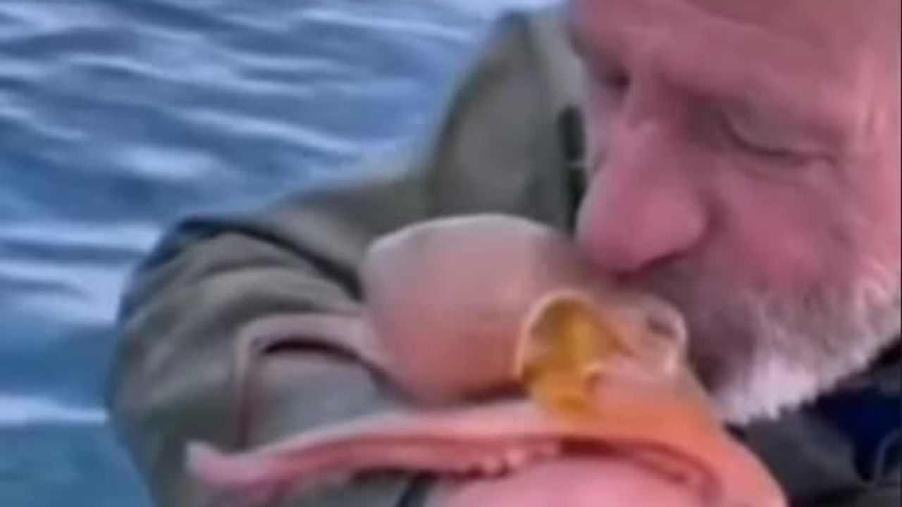 Aydın’ın Didim ilçesinde bir balıkçı, ağına takılan ahtapotu öperek sevdi ve tekrar denize bıraktı.