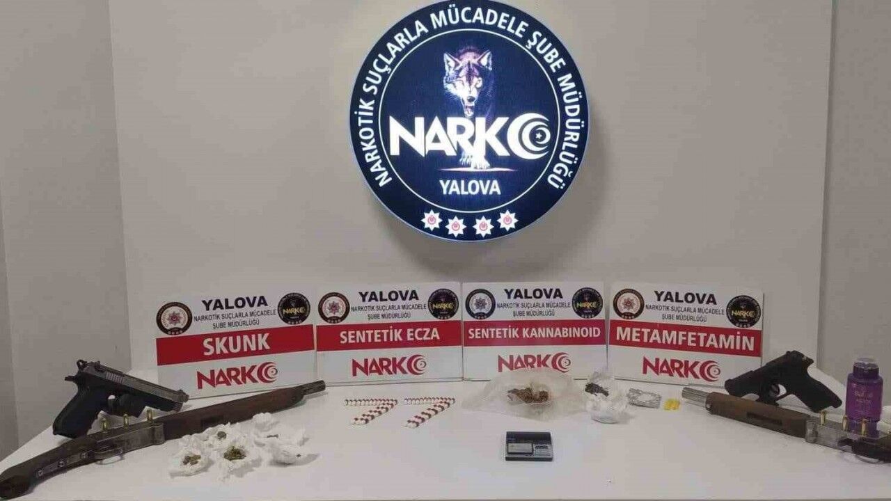 Alınan bilgiye göre, Yalova İl Emniyet Müdürlüğü Narkotik Suçlarla Mücadele Şubesi ekipleri, E.G’nin iş yeri ve yakın bölgesinde uyuşturucu ticareti yaptığı bilgisine ulaştı. Yapılan operasyonda E.G., F.A. ve E.K. gözaltına alındı. Şüphelinin iş yerinde yapılan aramada 59 sentetik ecza tablet hap, 17,51 gram sentetik kannabinoid, 6,50 gram skunk, 185 gram çözücü kimyasal madde, hassas terazi, 2 adet yarı otomatik av tüfeği, tabanca, 6 tabanca fişeği ve kuru sıkı tabanca ele geçirildi. E.G. emniyetteki işlemlerinin ardından sevk edildiği mahkemece tutuklanarak cezaevine gönderilirken, diğer 2 şüpheli hakkında ise kullanmak için uyuşturucu madde satın almak suçundan işlem yapıldı.