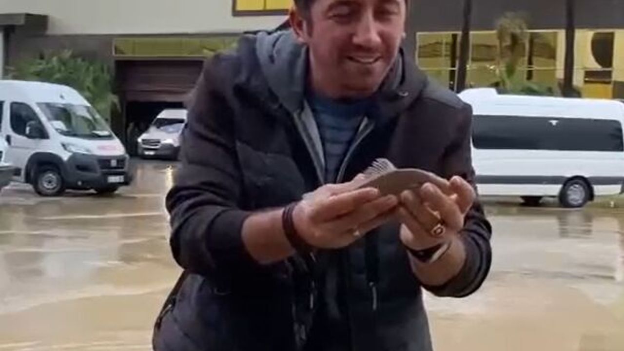 Yalova Altınova ilçesinde bulunan Çamdibi Barajı’nın açılmasıyla tersaneler bölgesindeki dere taştı. Taşan dereden oluşan birikintideki balıkları fark eden tersane çalışanı tatlı su sazanını elleriyle yakaladı.