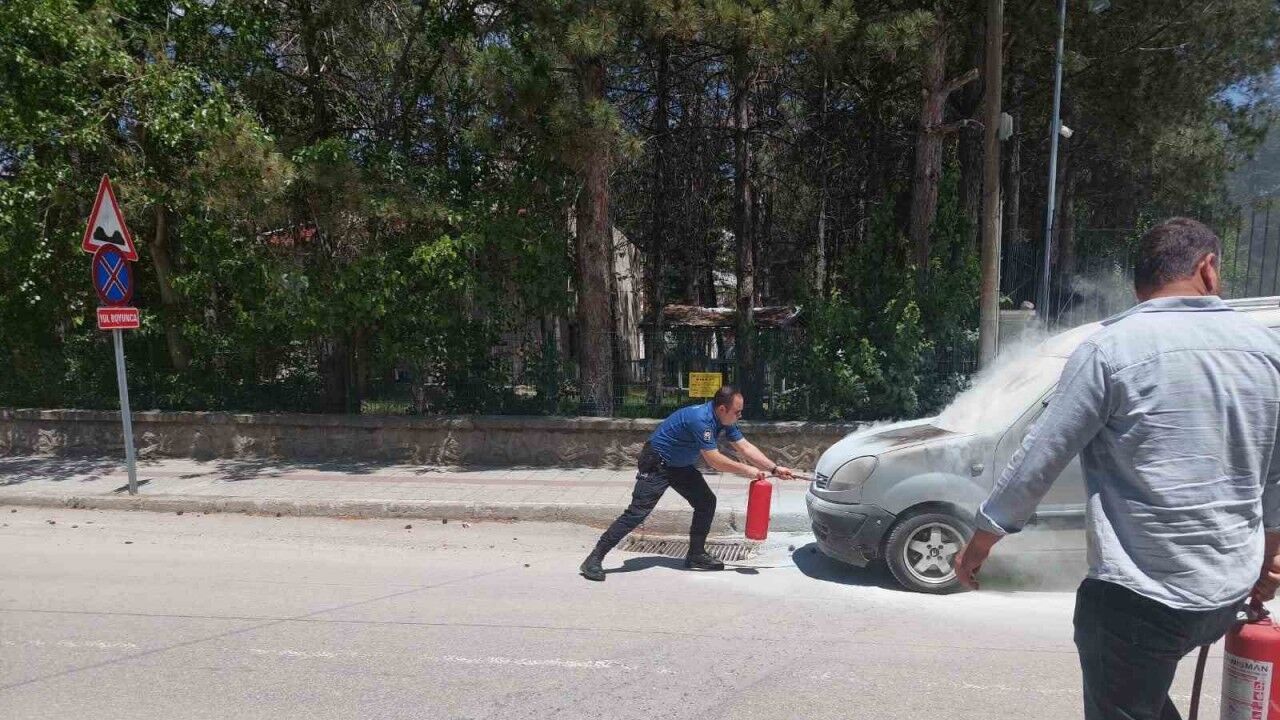Afyonkarahisar’ın Şuhut İlçe Emniyet Müdürlüğü binasının önünde bir anda alev alan araç polislerin yangın tüpleri ile yaptığı müdahale sonrası söndürüldü.