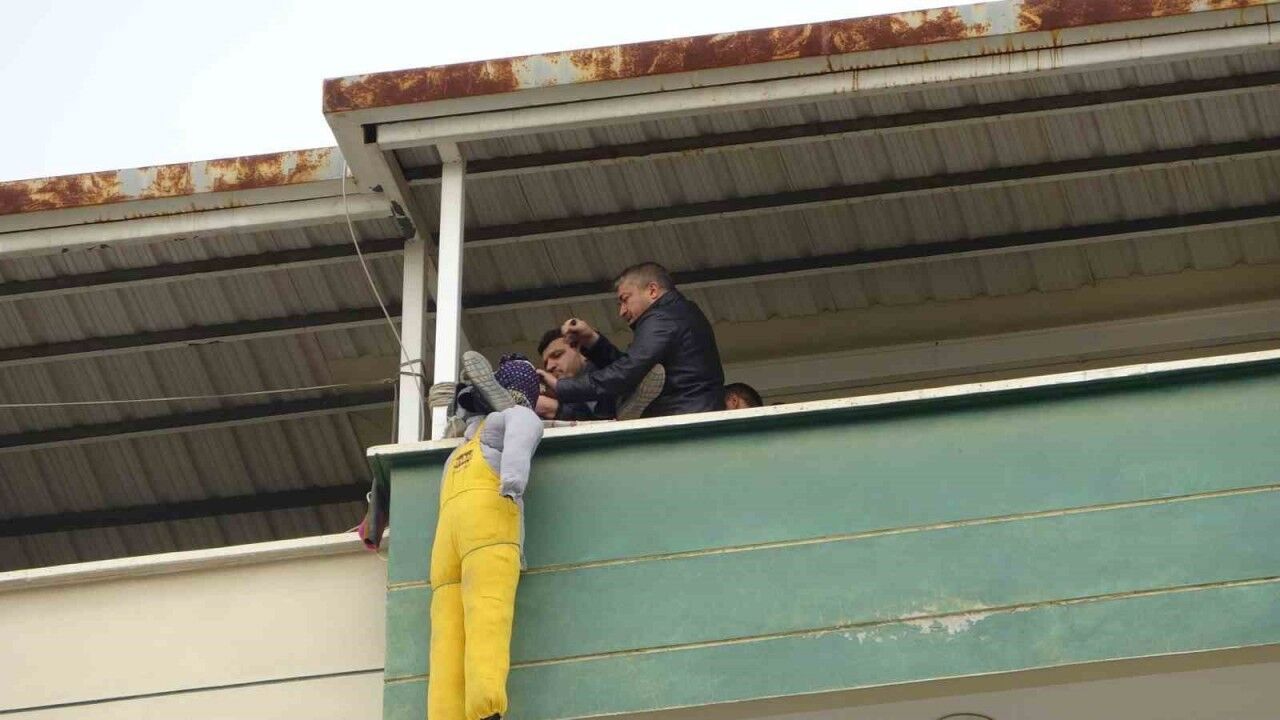 Malatya’da 7 katlı ağır hasarlı binanın yıkım kararına ihtiraz eden apartman sakini bir kadın, çıktığı teras katın demir ayaklarına kendini iple bağlayarak intihar girişiminde bulundu. Zaman zaman kendini aşağı sarkıtan kadını polis son anda kurtardı.