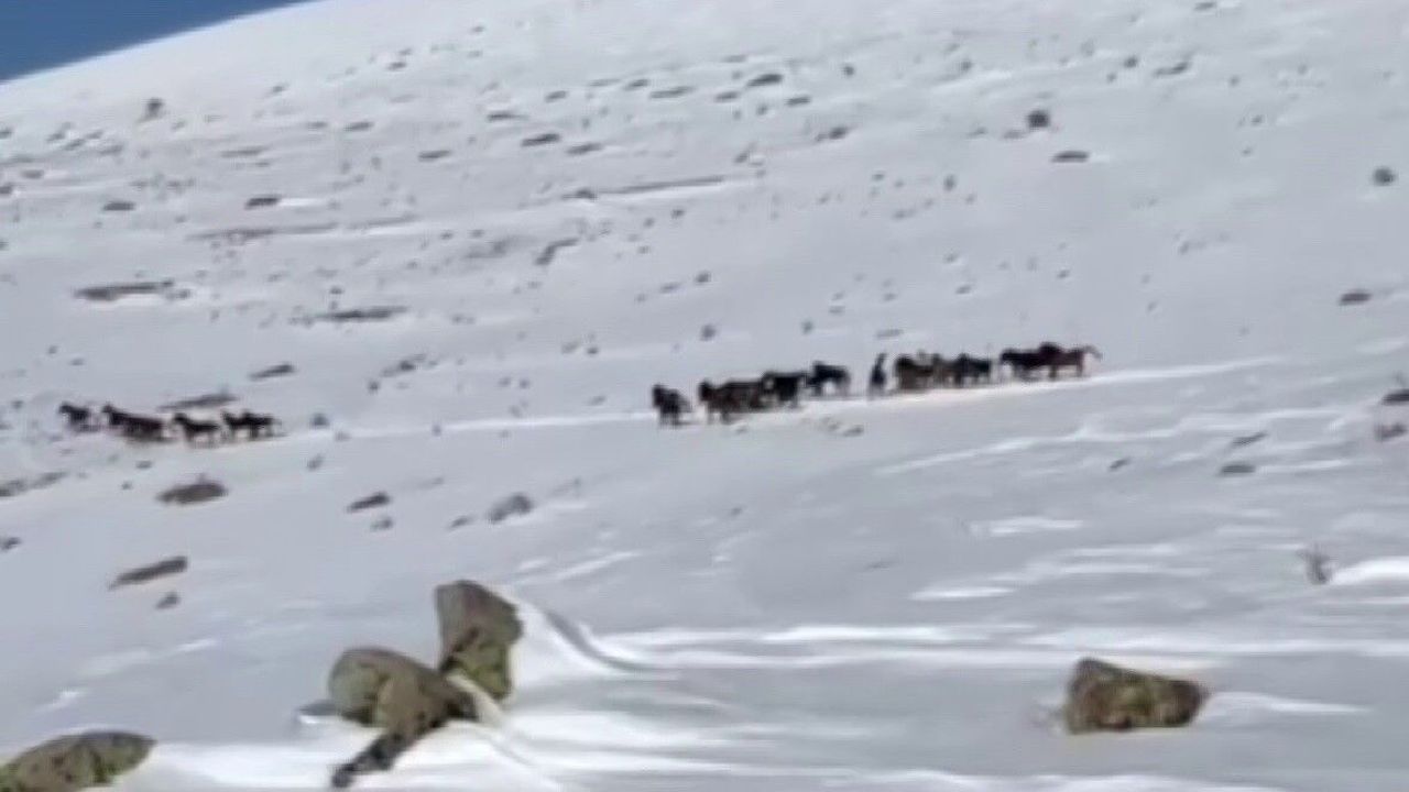 Sivas'ın Yama Dağları'nda karla kaplı arazide özgürce koşan yılkı atları, beyaz örtü üzerinde oluşturdukları görüntüyle hayran bıraktı.
