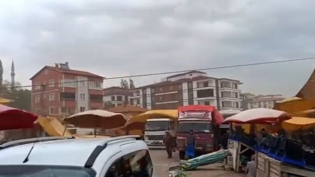 Yozgat’ın Sarıkaya ilçesinde etkili olan fırtına, ilçede kurulan semt pazarında etkili oldu. Alışveriş yapmak için pazara giden vatandaşlar fırtınanın etkisini göstermesiyle zor anlar yaşadı. Pazardaki şemsiyelerin uçtuğu anlar cep telefonu kamerasıyla görüntülendi.