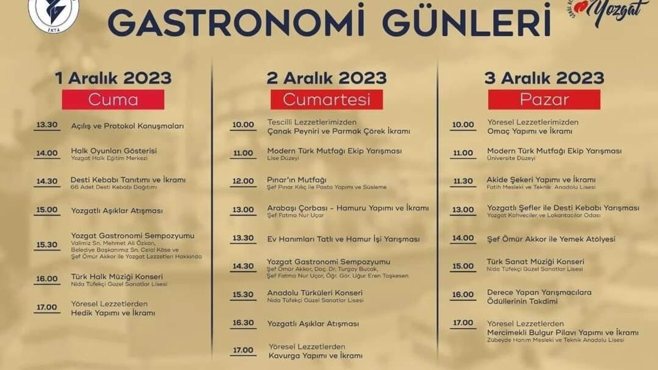 Cumhuriyet Meydanı’nda 1 Aralık Cuma günü başlayacak Gastronomi Günleri 3 gün sürecek. Yozgat’ın yöresel lezzetlerinin tanıtılacağı birçok etkinlik ve yarışmaların düzenleneceği Gastronomi Günleri etkinlikleri çerçevesinde birbirinden ünlü şefler hazırladıkları yemekleri ve tatlıları vatandaşların beğenisine sunacak.