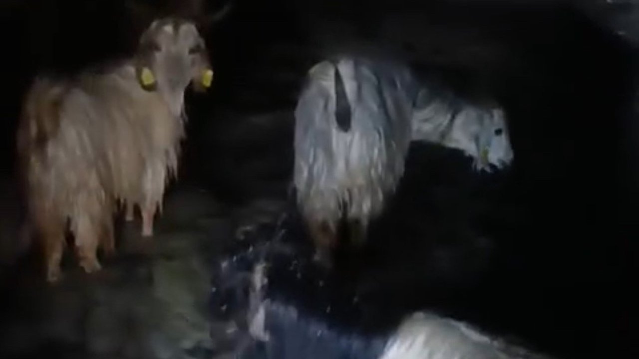 Hakkari'nin Yüksekova ilçesinde etkili olan sağanak yağış nedeniyle suyla dolan ahırdaki hayvanlar kurtarıldı.