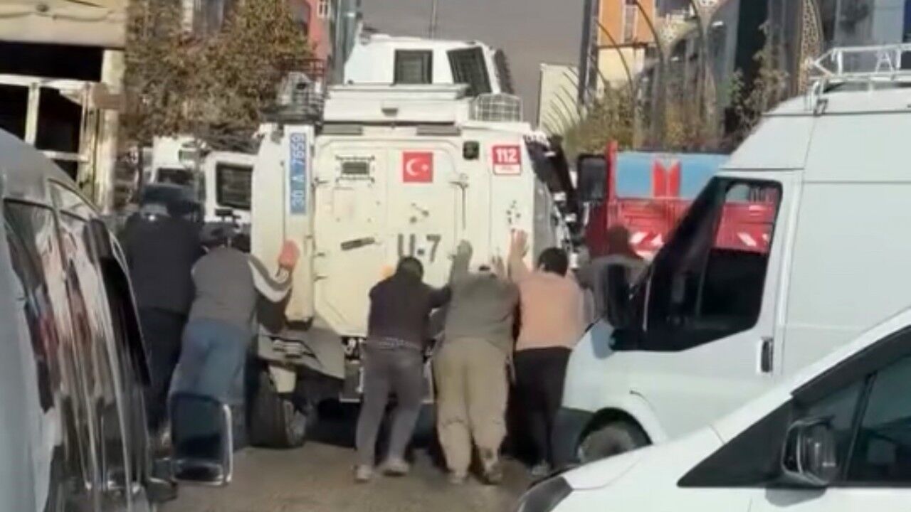 Hakkari’nin Yüksekova ilçesinde, arızalanarak yolda kalan bir zırhlı polis aracı, vatandaşların yardımıyla itilerek bulunduğu yerden çıkarıldı.