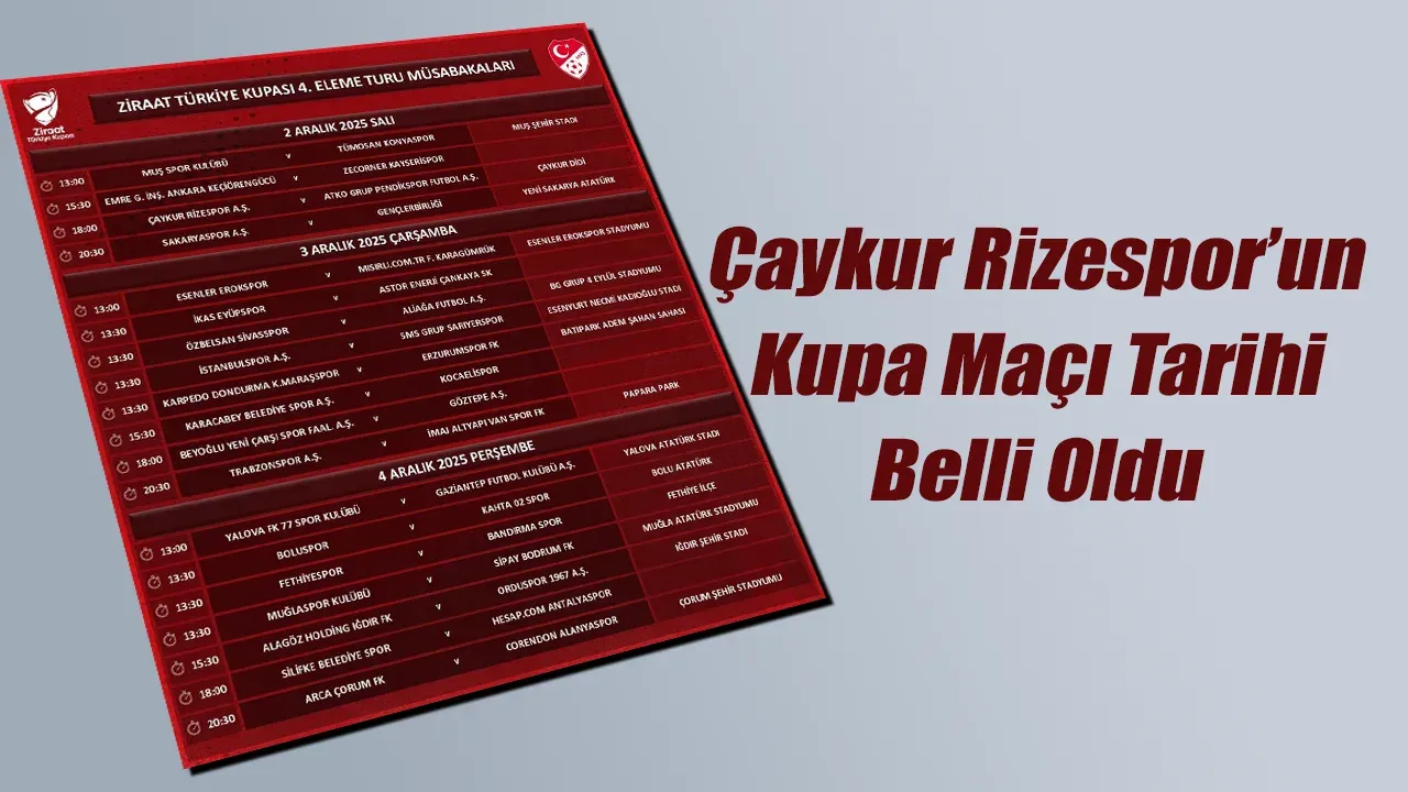 Ziraat Türkiye Kupası 4. eleme turunda karşılaşmalar 2, 3 ve 4 Aralık’ta tek maç usulüne göre oynanacak. Tur atlayan takımlar gruplarda mücadele etmeye hak kazanacak. Türkiye Futbol Federasyonu, kupa müsabakalarının programını da internet sitesinden yaptığı açıklamayla duyurdu.